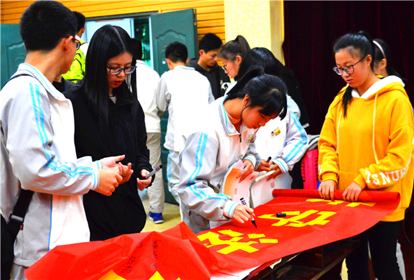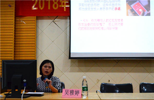 本次活动分为普法知识讲座、横幅签名、法律知识海报展览及授旗仪式四个环节。讲座现场,吴雅婷老师分别从“微信红包”的定义、涉及相关的民事和刑事法律风险三个方面进行普法宣传。通过紧贴生活的案例,结合严谨的法律知识,深入分析微信红包所存在的风险、问题以及相应的应对措施,让学生更好的识别相关诈骗现象,保护自身权益。期间,团委工作人员组织马甲中学的学生们进行横幅签名,参观法律知识海报,结合现场咨询讲解的方式,耐心地向在场学生解答微信诈骗的法律问题。