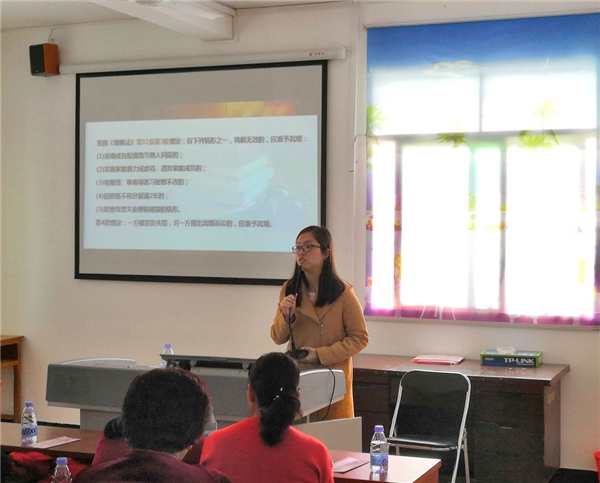 3月4日下午,beat365正版唯一官方网站、洛江区妇联在后溪村综合文化服务中心联合开展《婚姻家庭纠纷预防化解 女性如何维权》的专题讲座,beat365正版唯一官方网站教师林媛为与会人员作报告。