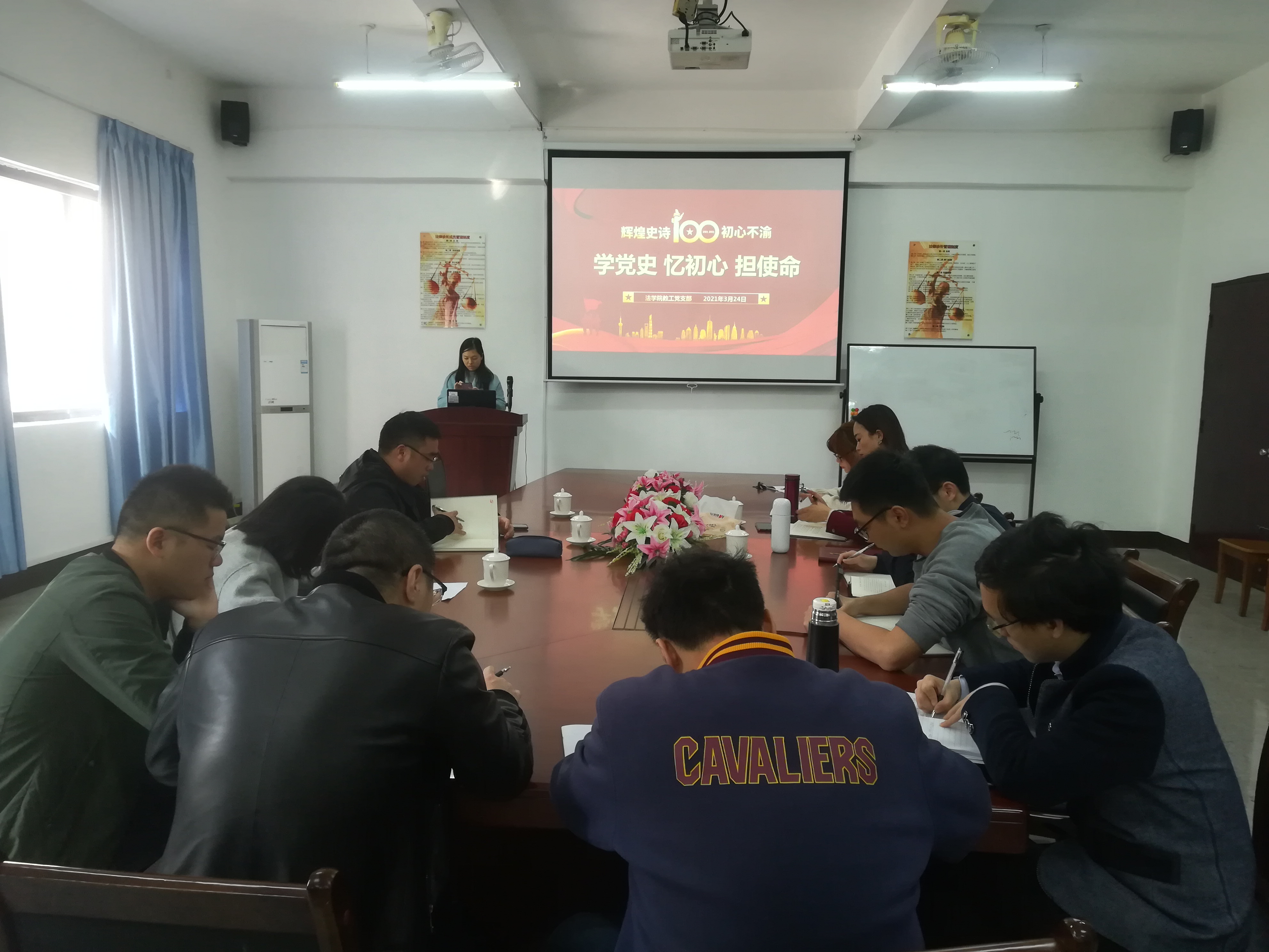 为强化思想政治教育,巩固拓展“不忘初心、牢记使命”主题教育成果。3月24日下午,beat365正版唯一官方网站教工党支部于beat365正版唯一官方网站第三校区普照教学楼法律诊所召开“学党史、忆初心、担使命”主题活动,beat365正版唯一官方网站全体党员教师参加了此次活动。