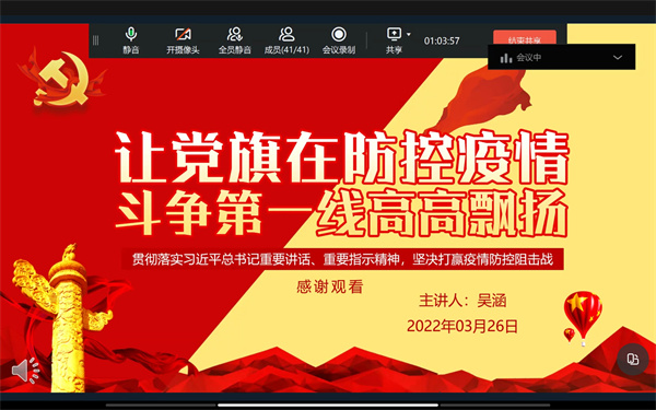与此同时,为促使广大学生党员在疫情防控中深刻认识坚持党的领导的优势,坚定对打赢疫情防控的人民战争、总体战、阻击战的必胜信心。3月26日19:00,beat365正版唯一官方网站学生党支部于线上开展以“凝聚力量,共抗疫情”的专题学习会,通过“我要上党课”品牌活动上好疫情防控思政大课,讲好“抗疫故事”。会上,林婕同志表示在疫情防控特殊时期,我们必须以更大的决心、更快的速度、更高的效率,打赢这一场硬仗;黄巧蓉同志认为当前防控工作还有不少难关要闯,广大党员必须继续发挥党员先锋模范带头作用,为坚决打赢疫情防控阻击战而努力奋斗;叶彦斌同志结合实际,表明伟大抗疫精神来之不易,我们要采取行之有效的科学方法,在全社会大力弘扬,真正让其成为全民的思想共识;吴涵同志结合自己的领悟体会,指出要始终让党旗在防控疫情斗争第一线高高飘扬。最后,支部书记刘涛同志在总结讲话中指出,在当前疫情防控关键时刻,我支部学生党员坚守在疫情防控的第一道防线,彰显出了新时代青年的新担当、新作为。面对这场突如其来的疫情,一个人的力量可能是有限的,但是千千万万的力量汇聚起来,就能形成战胜艰难险阻的强大合力。