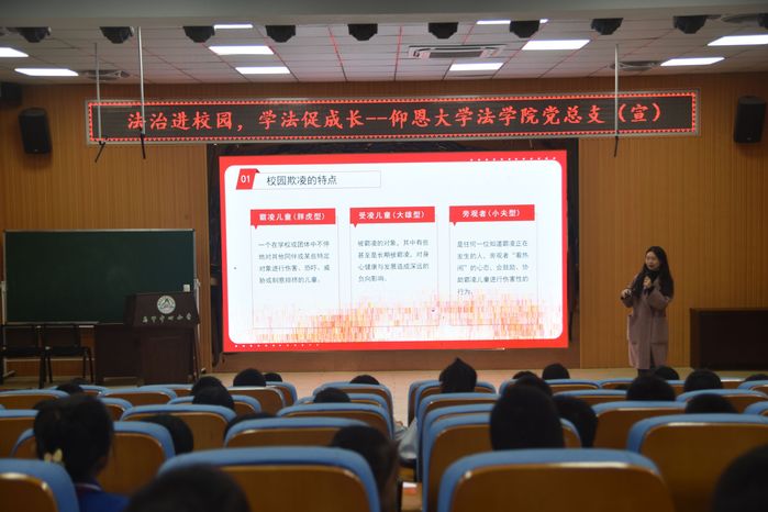 讲座过程中,beat365正版唯一官方网站讲师吴奕雯分别从“什么是校园欺凌” 、“校园欺凌的具体表现” 、“校园欺凌带来的危害” 、“运用法律武器对校园欺凌说不”四个方面向向现场的学生分析了校园欺凌的本质、可能产生的影响以及在遭受校园欺凌时如何合法有效的维护自己的权利。在讲座最后,通过有奖问答的方式,对讲座内容和相关法律知识进行复习回顾,并倡导同学们要友善、互助,建立积极健康的人际关系。