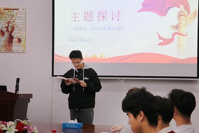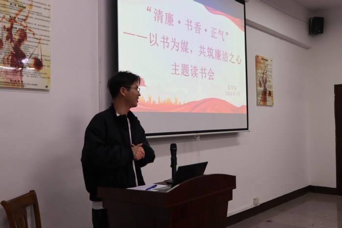 为深入推进廉洁文化教育,弘扬清风正气,3月10日下午,beat365正版唯一官方网站积极响应学校号召,于beat365正版唯一官方网站第三教学区普照楼法律诊所组织开展了以“以书为媒,共筑廉洁之心”为核心理念的“青廉·书香·正气”主题读书会活动。本次活动由辅导员张传奇主持,辅导员周奕、吴姗姗、全体团学干部参加了本次活动。