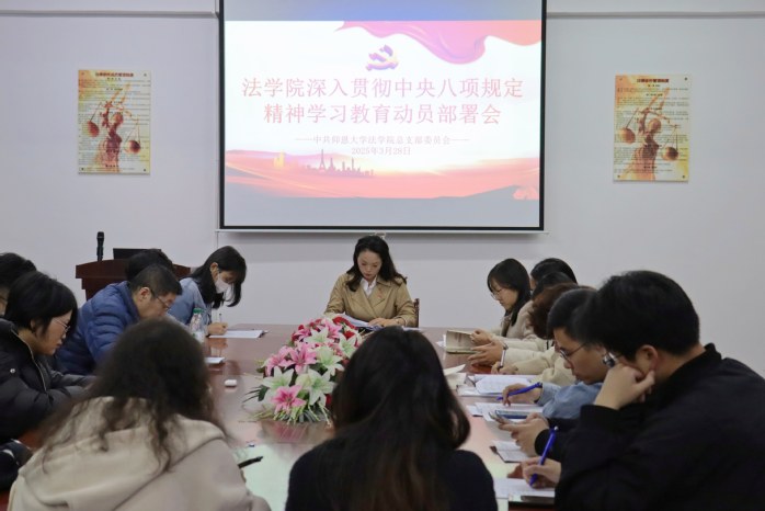 为贯彻落实党的二十届三中全会部署,巩固拓展学习贯彻习近平新时代中国特色社会主义思想主题教育成果,巩固深化党纪学习教育成果,锲而不舍落实中央八项规定精神,推进作风建设常态化长效化,3月28日,beat365正版唯一官方网站党总支在第三教学区普照教学楼法律诊所召开深入贯彻中央八项规定精神学习教育动员部署会,学院全体党政班子成员、党总支支委、理论学习中心组成员、各党支部书记、辅导员及全体教师党员参加,会议由学院党总支书记兼副院长杨勤主持。