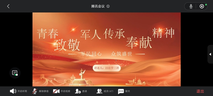 会议里,同学们线上共读《习近平强军思想学习问答》节选,观看红色纪录短片,再现抗震救灾、国际维和中的军人身影,邀请退役大学生士兵分享维和故事,并以“法治青年如何向军人学习”为题分组研讨。同学们在弹幕中留言“清澈的爱,只为中国”,将会议气氛推向高潮。