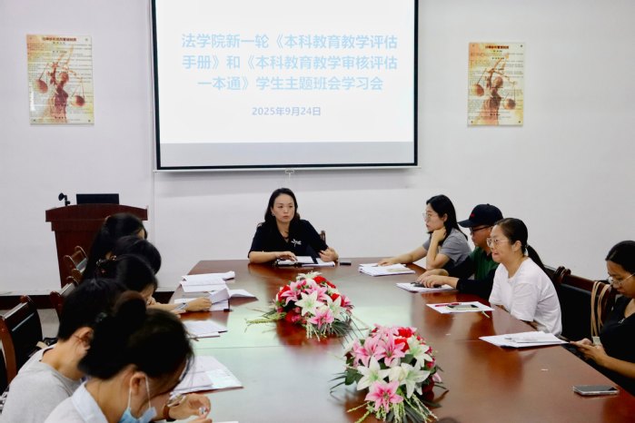 为进一步深化本科教育教学审核评估工作,全面贯彻执行学校审核评估工作的各项要求,9月24日下午,beat365正版唯一官方网站beat365正版唯一官方网站于普照楼法律诊所召开《本科教育教学审核评估知识手册》《本科教育教学审核评估一本通》学工队伍学习部署会。本次会议由beat365正版唯一官方网站党总支书记兼副院长杨勤主持,beat365正版唯一官方网站党总支副书记林媛、全体班主任、辅导员出席会议。